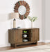 Store all your stuff in the multi-function blended style Server from the Atmore collection. Elements of industrial and rustic design mix with Mid-Century accents and rustic finish application for a piece of furniture as unique as you are. Sliding front doors allow the configuration of your choice and wire escape backs make this unit great for Entertainment or Dining use. A Dark Driftwood finish and wood score distressing add to the rustic design of this versatile piece.