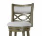 The New Classic Furniture Manchester Pub Height Swivel Bar Stool is a functional and durable seating solution designed for comfort and style. Crafted from quality Rubberwood solids and manufactured wood, ensuring long-lasting strength. Featuring a seat height of 29”, the stool's legs are reinforced by a circular footrest, providing added stability and functionality. With a 360-degree swivel, this barstool effortlessly rotates for convenient use at kitchen islands or bars. The full foam seat cushions and backrests, upholstered in easy-care light gray 100% polyester fabric, offer a plush and cozy seating experience. The distinctive interlocking wave wood back and thickly welted upholstery add a touch of sophistication to the overall design. Easy assembly is a snap with the included instructions. Elevate your bar, counter, or kitchen island with the Manchester Bar Stool, where durability meets distinctive style.