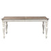 Create a grand gathering with the Magnolia Manor table set, consisting of upholstered splat back side chairs and a rectangular leg table. Crafted of poplar solids with cathedral white oak veneer, this kit features an antique white finish with heavy chipping and a weathered brown top with whitewash. The table offers a fancy face top, canted corners, two 18" leaves to easily accommodate guests or a large family and is anchored by faceted turned legs. The chairs feature the perfect blend of European design with upholstery in ivory tweed chenille, dog bone accents on the splat back, tufted back panel, nylon chair glides to protect your flooring, and beautifully faceted turned legs. Warm antique finishes and artistic distressing along with grand scale create a piece to be passed to generations.