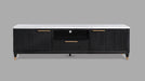 This entertainment console brings modern luxury and sleek sophistication to any living space. Featuring a striking contrast, fluted wood facade with a pristine faux marble top, this piece embodies refined elegance. Brass-tone accents and tapered legs add a touch of mid-century flair, enhancing its chic, upscale appeal. With generous storage space behind its textured doors and an open center shelf for easy access to media components, this console is as functional as it is stylish. Ideal for contemporary interiors, it’s the perfect blend of high-end design and everyday practicality, making it a standout addition to your home decor.