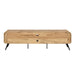 The Rowan 71" TV Console combines mid-century style with functional design. Its low profile supports larger TVs while maintaining a sleek look. Made from eco-friendly wood in a warm oak finish, it features rounded edges, black hardware, and tapered legs. Two drawers and open center shelves offer organized storage for media and accessories—perfect for modern entertainment spaces.