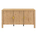 The Thayer 55" Sideboard blends natural warmth with modern versatility. Crafted from eco-friendly wood in a natural oak finish, it features clean lines, vertical reeded detailing, and rich woodgrain texture. Four cabinet doors conceal adjustable shelves and rear cable cutouts, making it perfect for storing dinnerware or housing media equipment. A stylish piece that works beautifully as a dining sideboard or living room TV console.