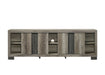 This entertainment console merges rustic charm with urban sophistication. Crafted with a weathered wood finish, it exudes an aura of refined comfort while offering a nod to pastoral aesthetics. The console's structure boasts clean lines and a spacious top surface, ideal for showcasing a flat-screen TV and decorative items. Below, open shelving provides an organized space for media devices, books, and accents. The sliding side doors add to the functionality, offering concealed storage that keeps the living space clutter-free.