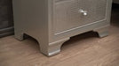 Step into a realm of sophistication and comfort with this stunning bedroom collection. Each piece showcases an exquisite blend of traditional charm and contemporary flair, making a bold statement with its textured surfaces and elegant finish. The bed, a centerpiece of luxury, features a sumptuous, tufted headboard with integrated lighting that invites a touch of opulence to your restful retreat. Coordinating storage solutions, including a dresser, chest, and nightstand, offer ample space with their gracefully designed drawers, accented with shimmering hardware that complements the set’s chic aesthetic.