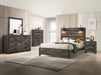 This bedroom set marries rustic appeal with contemporary lines, offering a cozy yet refined aesthetic to any modern home. The set features a generously sized bed with a broad, planked headboard with integrated sconces, creating an inviting ambiance. Flanking the bed are a matching nightstand and a chest, each providing ample storage with a series of drawers that glide open effortlessly. The dresser, complete with a wide mirror, offers additional storage and an area to get ready, all while contributing to the room’s open feel. The distressed wood finish of each piece is complemented by dark metal hardware, adding an industrial touch to the ensemble.