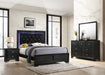 Step into a realm of sophistication and comfort with this stunning bedroom collection. Each piece showcases an exquisite blend of traditional charm and contemporary flair, making a bold statement with its textured surfaces and rich finish. The bed, a centerpiece of luxury, features a sumptuous, tufted headboard with integrated lighting that invites a touch of opulence to your restful retreat. Coordinating storage solutions, including a dresser, chest, and nightstand, offer ample space with their gracefully designed drawers, accented with shimmering hardware that complements the set’s chic aesthetic.