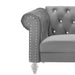 The New Classic Emma Chesterfield Velvet 2 Seat Sofa Loveseat is a blend of soft elegance and sophisticated design. Crafted from 100% polyester velvet fabric, it offers cozy and indulgent seating for two. The glam tailoring features tufted backs and arms adorned with glimmering crystal buttons, adding a touch of luxury without compromising comfort. Upscale accents, including silver nailhead trim on the rolled arms and silver turned bun feet, enhance the velvet fabric. Shipped unassembled for easy placement in any home, its lower profile height makes it small space-friendly, fitting well into smaller rooms while providing full-size seating. Enjoy supportive seating with full foam cushions that provide ample comfort. Add a little sparkle in your home with the Emma Loveseat.
